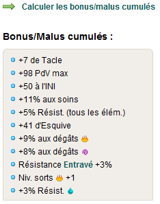 Calcul des bonus/malus cumulés des équipements choisis : Tout est très simple. WakfuWorld est doté d'un calculateur des bonus/malus cumulés de votre équipement en fonction des stats des équipement contenus dans la base de données du site. Les calculs des bonus des équipement s'affichent sous le mannequin, dans une sorte de fenêtre.