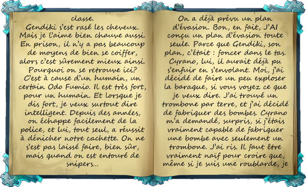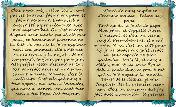 Eh oui, vous l'auriez compris, la dernière page du journal d'Isaure est celle que Gendiki donne à Auriny. Bien sûr, le sacrieur y a fait quelques modifications, mais dans l'ensemble, vous comprenez maintenant pourquoi une telle page dans un journal ^^