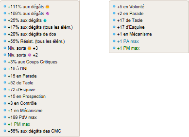 Si tu souhaites un po supplémentaire il vaut mieux aller le chercher sur la coiffe (initié, sage), ça peut être plus agréable mais ce n'est pas indispensable. Sinon en arme le must ça reste quoiqu'il arrive arme à 1 main (zeo, frog, sceptre, double-entaille) + dague (sangui, daägue, daguawotte).